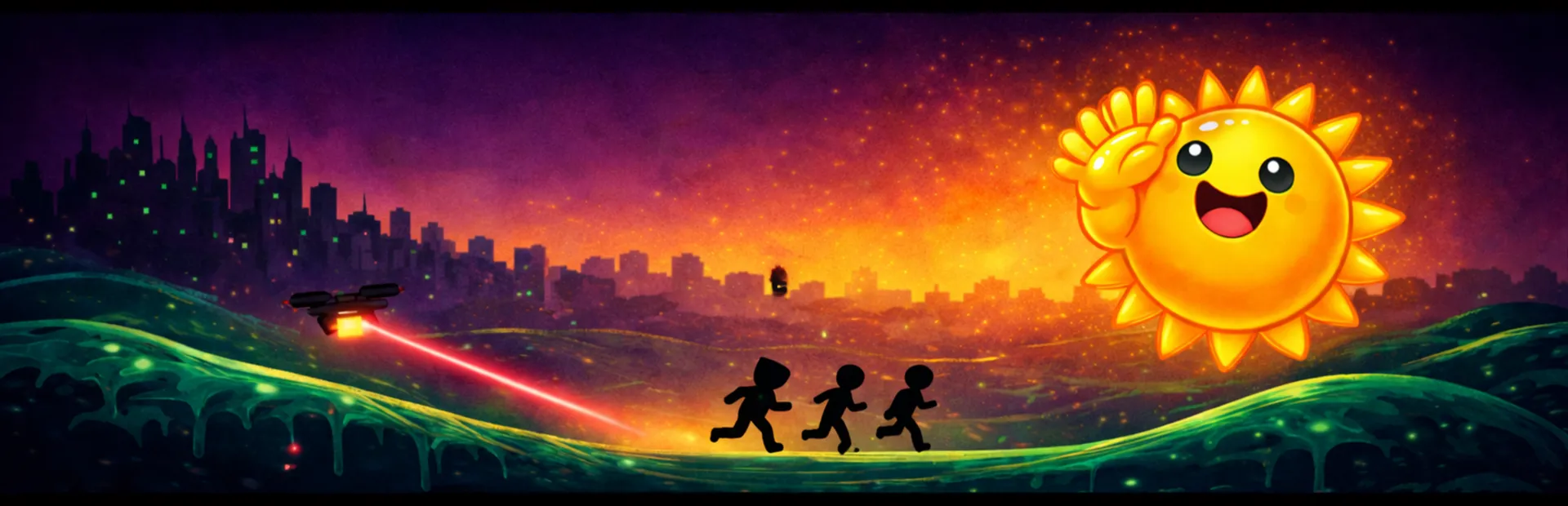 A satirical idle game about automating the entire AI content pipeline — from humble prompt templates to autonomous combat drones — while civilization politely disintegrates in the background.